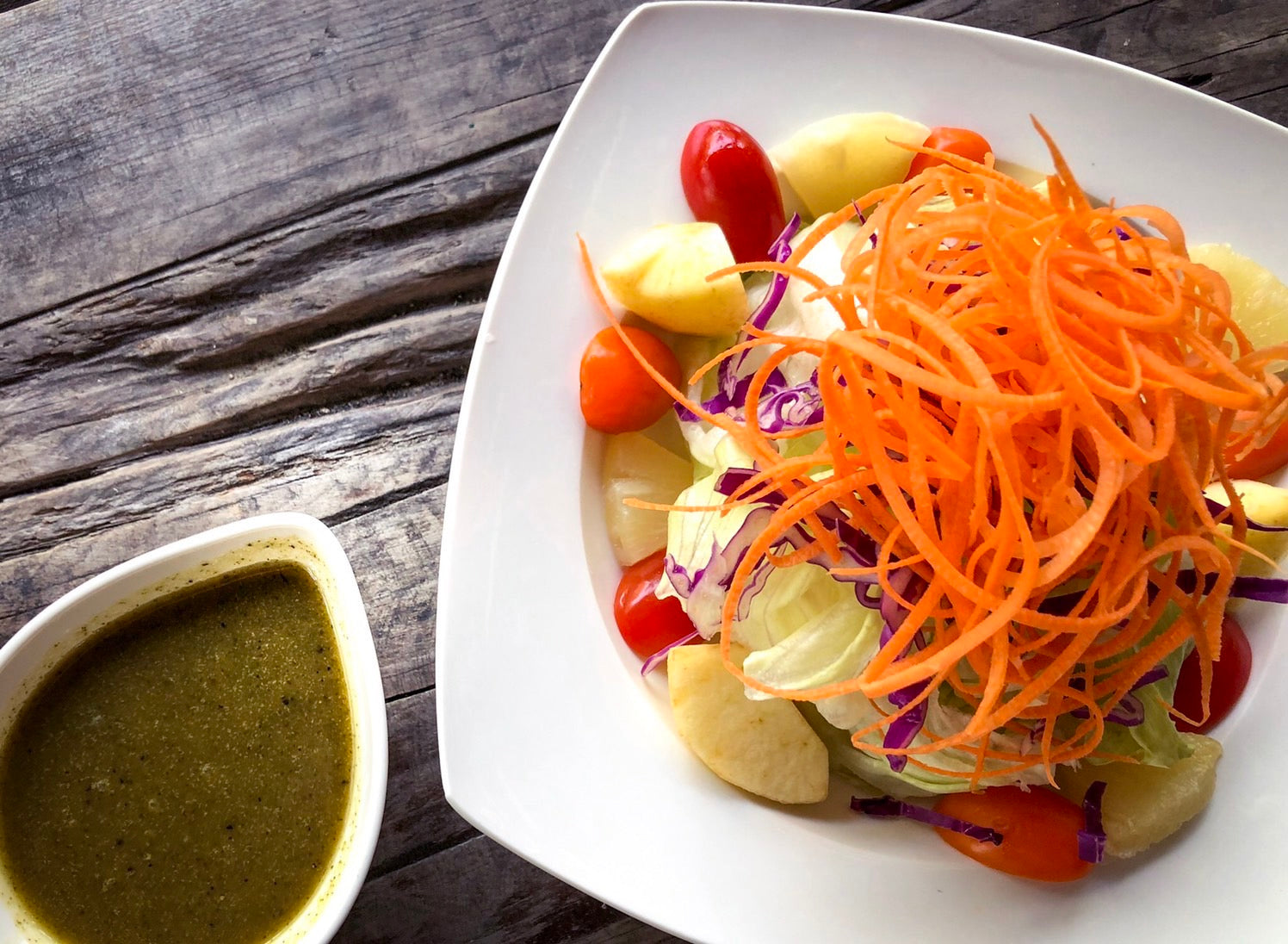 自製薄荷沙拉醬,使用雅植自家栽種的新鮮薄荷,加上天然食材,鳳梨、橘子、蘋果、桔子、薄荷、黑胡椒、橄欖油,調製而成,自然無添加。淋少許在新鮮當季蔬果盤上,一入口瞬間充滿薄荷香氣,輕爽口感,令人回味無窮。